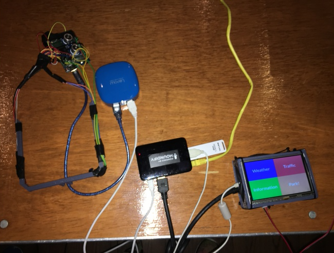 The wearable dashboard was built with Raspberry Pi and a touchscreen. We used a Node.js backend with iceweasel helping us with our front-end. In addition, we built an iOS application to gather the user's location which communicated with our Node.js backend. Our project was deployed on Heroku and our Raspberry Pi used Flask on the backend.