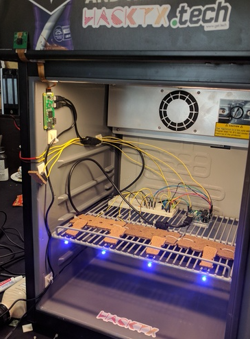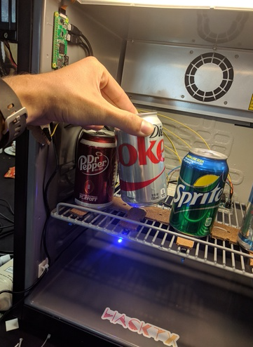 Hack a Cold One is a IoT smart fridge. A Raspberry Pi is used as the central control unit for the fridge connected with a plethora of sensors through an Arduino Uno and a camera module. The Uno uses digital I/O pins to connect to the four switches beneath the drinks, and acts as a digital switch for the electromagnetic switch.
