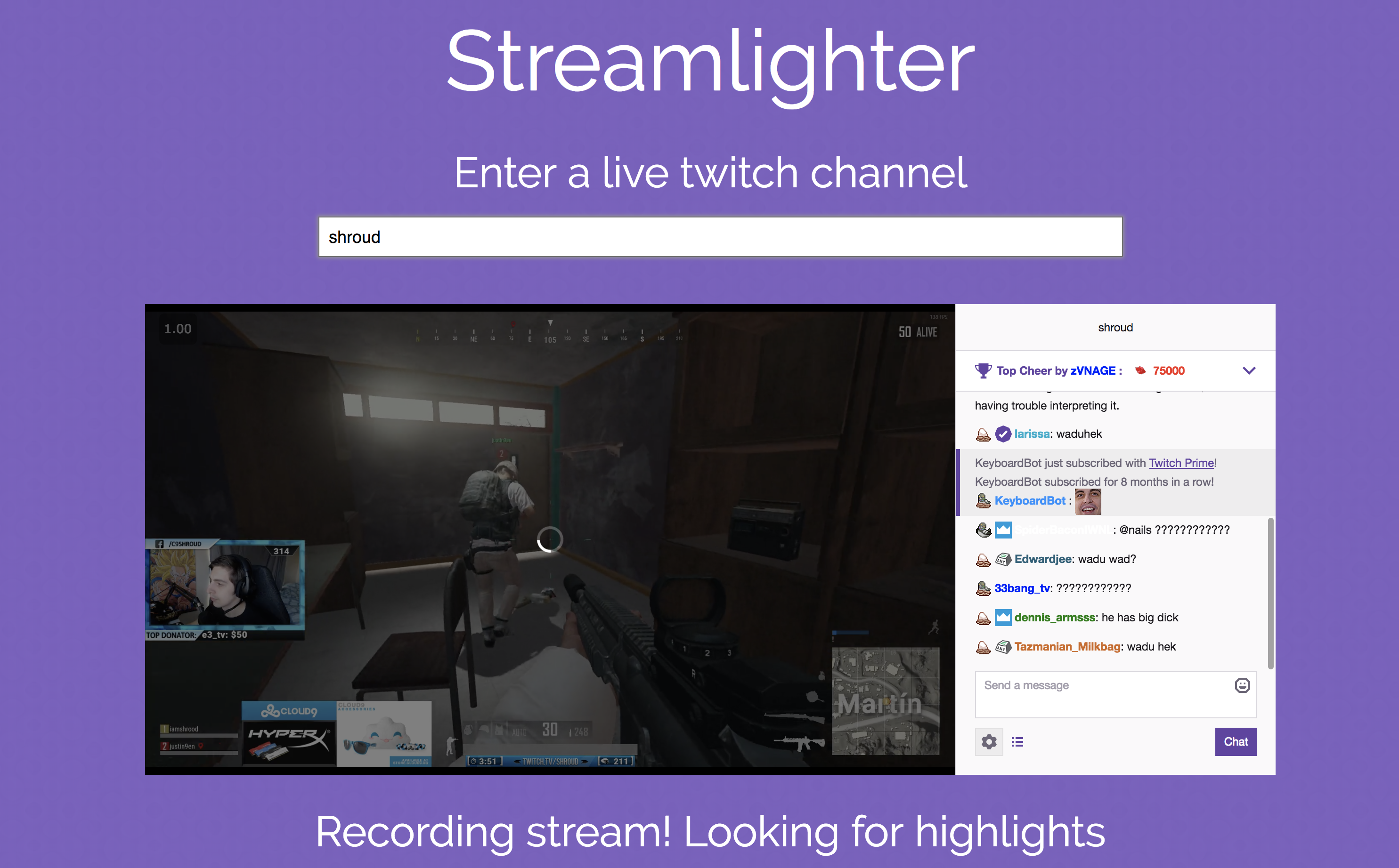 To begin, we looked at Twitch, a popular streaming website that focuses on video game live streaming, including broadcasts of eSports competitions, in addition to creative content. We made a small web app to compliment this. The user can type in the address of a channel they are interested in, it will start looking at the stream to see if there is a highlight. If there is one, it will record it, and then make it available as a download.